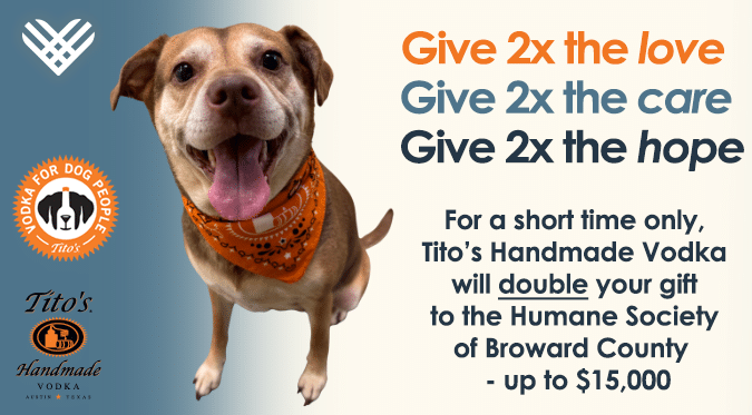 When you make a gift for the animals today, your donation will provide twice the love, care, and hope for our furry friends. Thanks to the generosity of our sponsors at Tito’s Handmade Vodka, all donations made before midnight on December 3rd will be doubled up to $15,000.