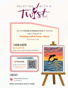 Join the Friends of Animals Club for Painting with a Purpose at Painting with A Twist – Davie 5810 S. University Dr. Davie, FI. 33328 Tuesday, March 3, 2026