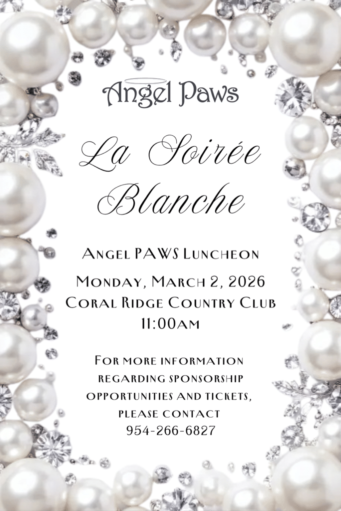 Angel PAWS Luncheon La Soirée Blanche Monday, March 2, 2026 11 am  Coral Ridge Country Club 3801 Bayview Drive Fort Lauderdale, FL 33308 Ticket Price: $250 per person